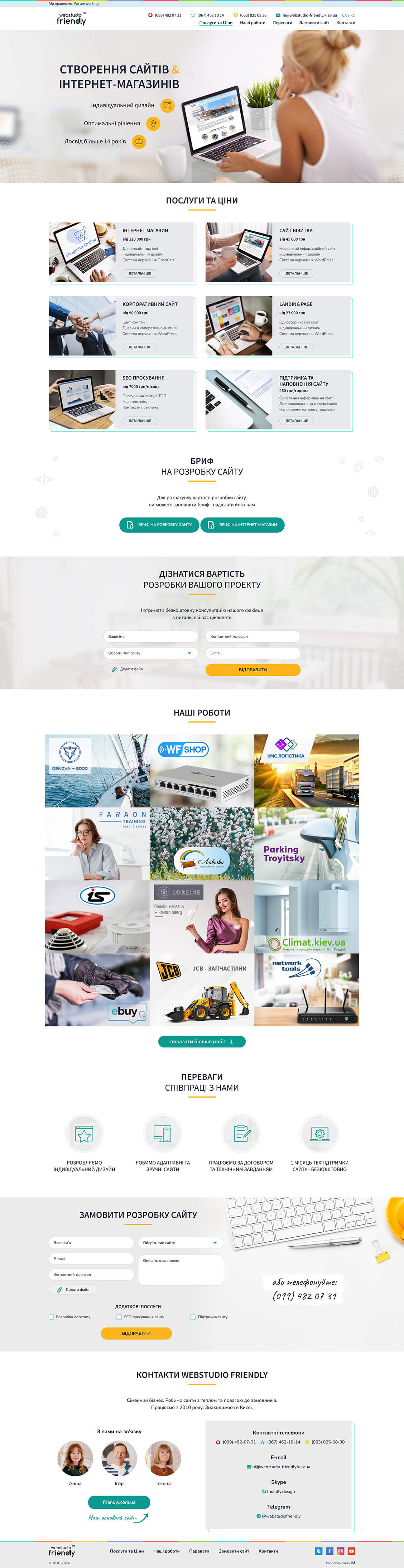 Разработка landing page для нашей веб-студии. Для презентации наших услуг и примеров реализованных проектов был разработан дополнительный сайт, выполненный в формате лендинга, где вся основная информация размещена на одной странице. Дизайн сайта выполнен в современном минималистическом стиле. Верхняя полоса с логотипом, меню и контактами – зафиксирована, и при прокрутке страницы остается сверху. Выполнена адаптивная, кроссбраузерная верстка для комфортного просмотра сайта на разных устройствах. Дизайн мобильной версии имеет упрощенный дизайн с классическим гамбургер-меню. У сайта есть две языковые версии: украинская и русская.